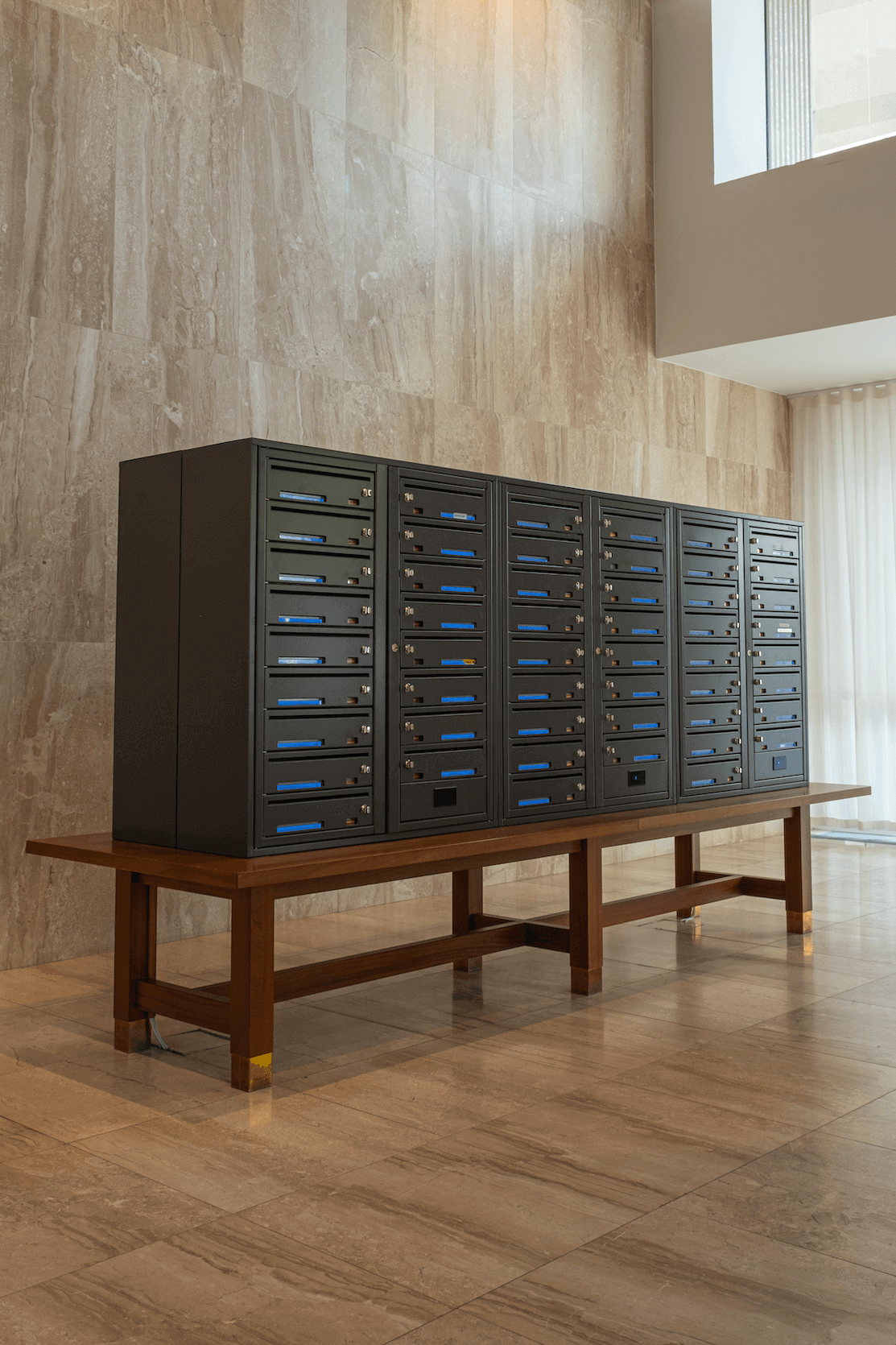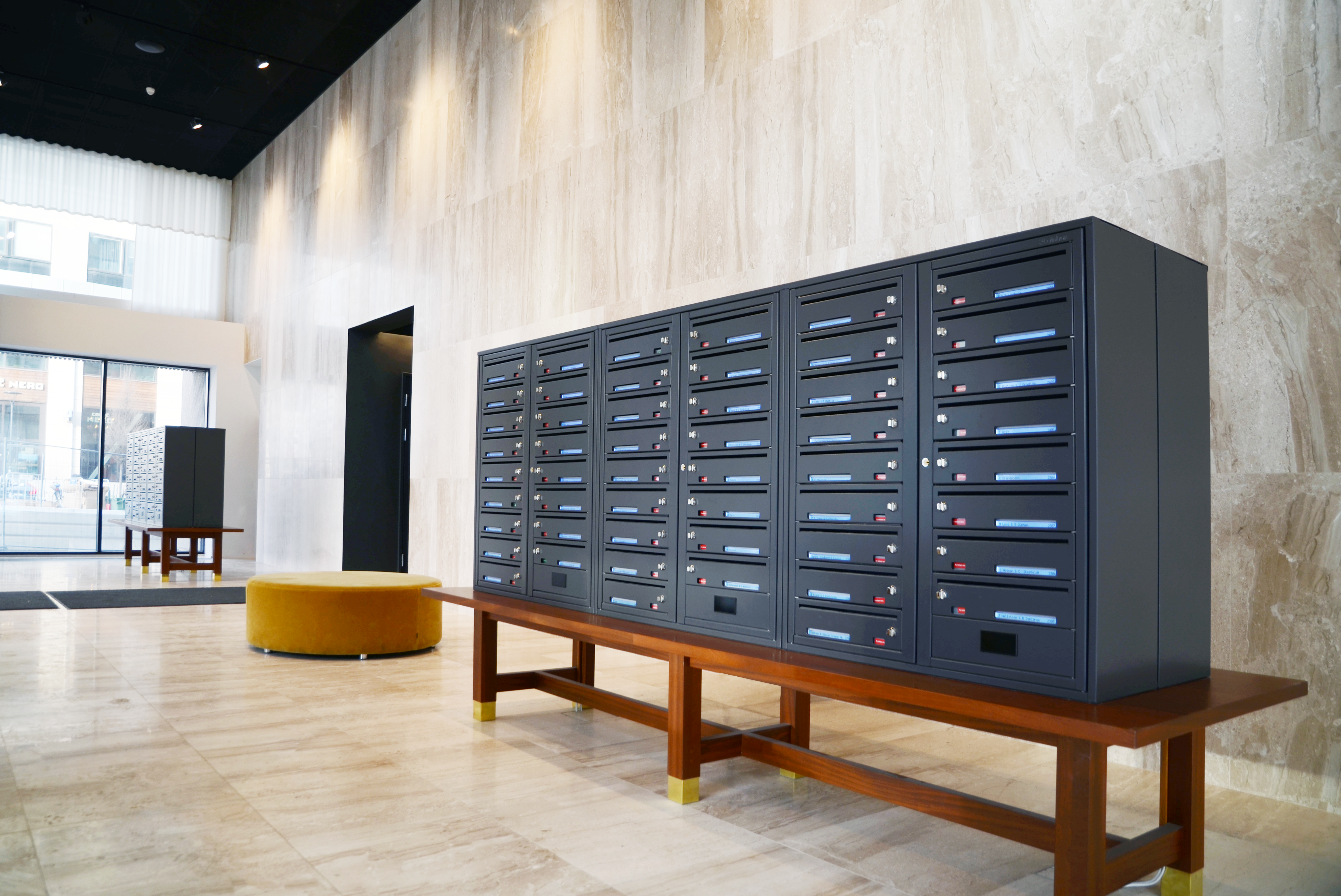 I norra delen av Stockholm ligger två spektakulära torn som vi är stolta att få ha bidragit till! BRF Innovationen har cirka 180 bostadsrätter. I tornets stilrena entré finner man Dinbox Liggande Digital ståendes på ekbord. Fastighetsboxarna är specialbeställda i färg NCS S 8000-N.