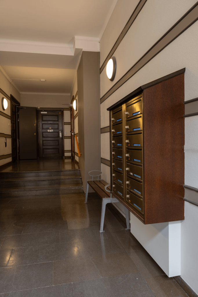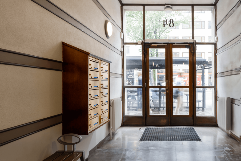 I den här fastigheten sitter digitala fastighetsboxar i mässing. Installatören har byggt in boxarna med en träram och här är ett gott exempel på hur fastighetsboxarna diskret kan bli en del av den stilrena entrén.