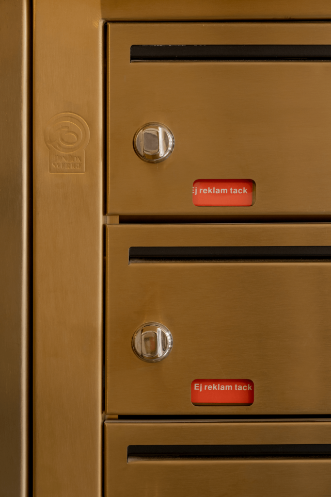 I Stockholm hittar vi BRF Kristallen som har installerat Dinbox fastighetsbox Svenskboxen Kompakt i mässing som är inbyggd i entrén. Även digitala namnskyltar...