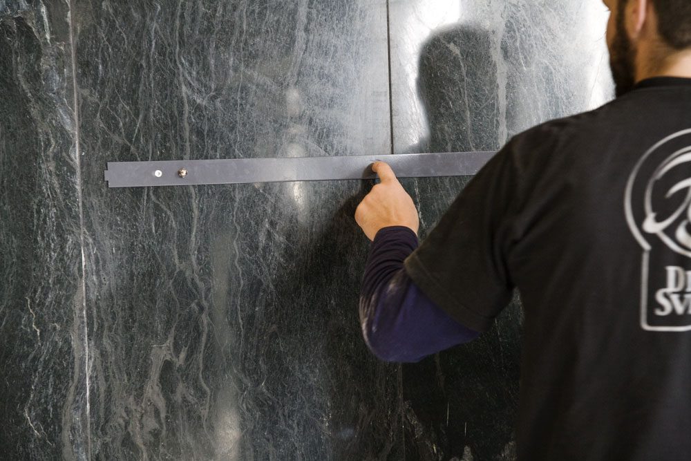 2. Mät upp var den övre monteringsskenan ska sitta och märk ut på väggen.