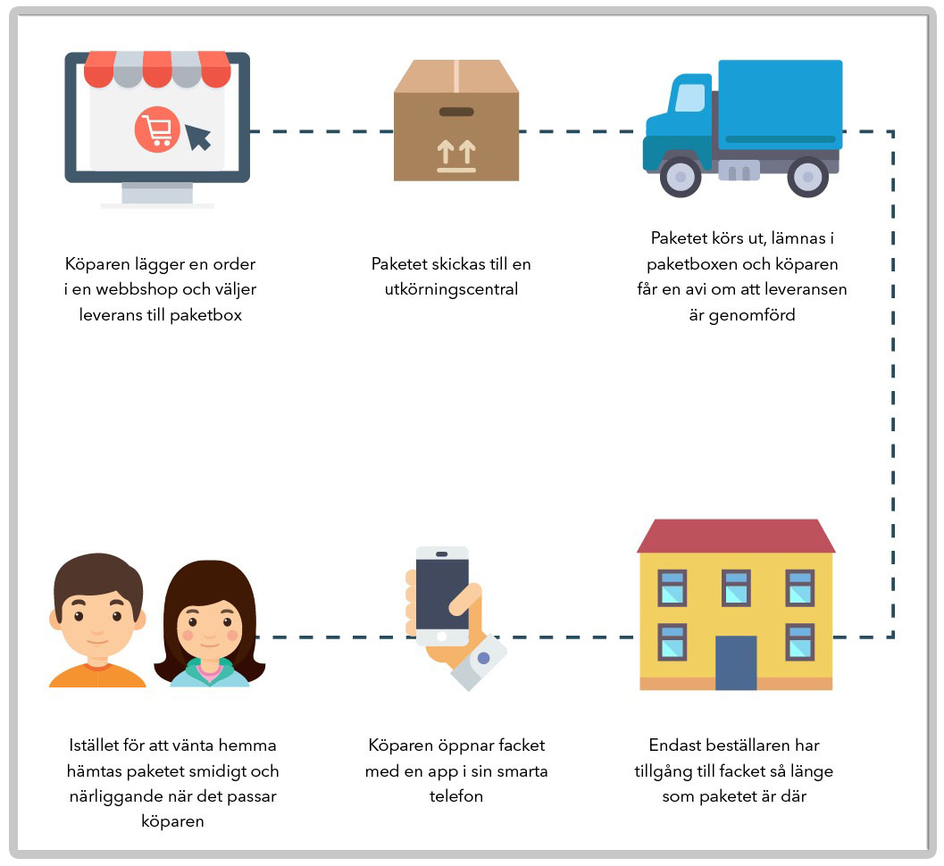 Antingen får man paketet till sitt lokala postombud, och då måste man gå dit för att hämta paketet eller göra en retur, eller så måste man stanna hemma på tider som inte alltid passar. Lösningen på problemet är paketboxen. Paketboxen placeras i trapphuset i entrén, har rymliga fack anpassade för lite större paketleveranser och bud och speditörer får tillgång till trapphuset via en app. När man gör en beställning bokas ett ledigt fack där budet kan lämna av paketet, som beställaren sedan hämtar upp när den kommer hem.
